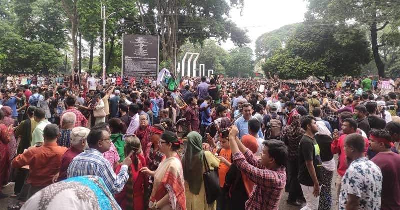 মানুষের ঢলে জনসমুদ্রে পরিণত হয়েছে রাজধানীর কেন্দ্রীয় শহীদ মিনার এলাকা। পুরো ঢাকা শহর থেকে দলে দলে বিক্ষোভ মিছিল নিয়ে শহীদ