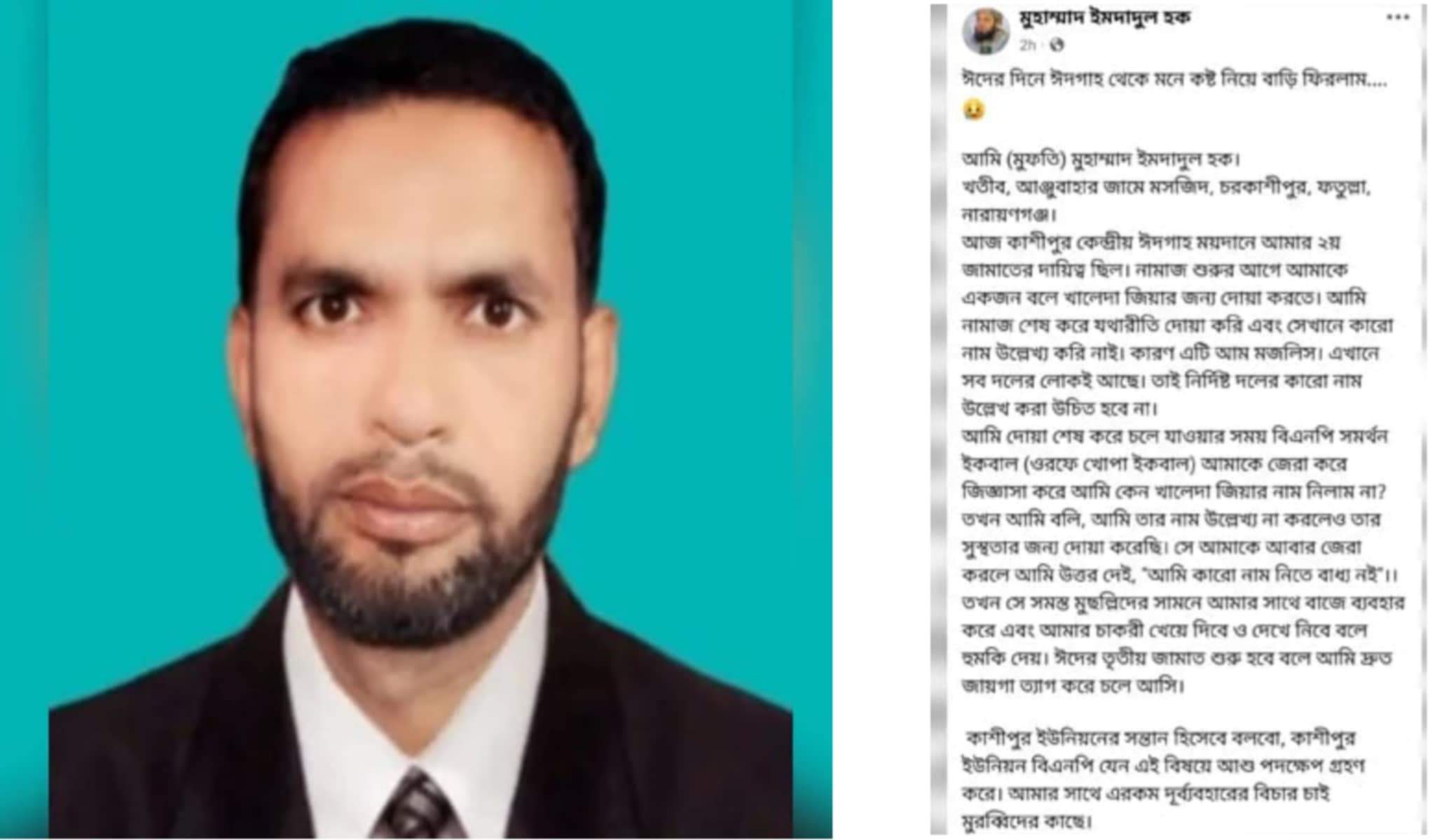ফরিদপুরে ঈদের জামাতের ইমাম ইমদাদুল হককে হেনস্তা ও চাকরি থেকে বরখাস্তের হুমকি দেওয়ার অভিযোগ উঠেছে। ইমাম একইসঙ্গে বাংলাদেশ ইসলামী আন্দোলনের