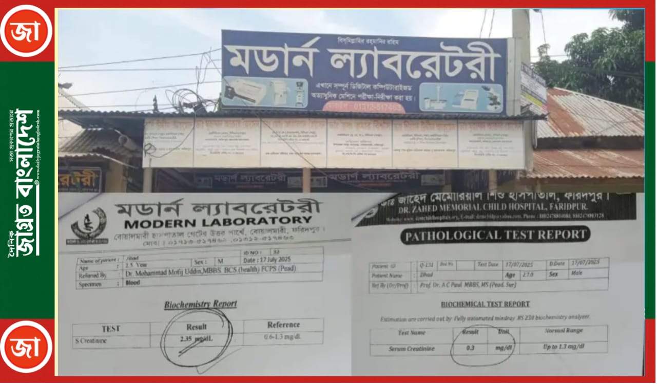 ফরিদপুরের বোয়ালমারী উপজেলা স্বাস্থ্য কমপ্লেক্সের সামনে অবস্থিত মডার্ন ল্যাবরেটরির বিরুদ্ধে একটি আড়াই বছর বয়সী শিশুর কিডনি সংক্রান্ত ‘ভুয়া’ রিপোর্ট দেওয়ার