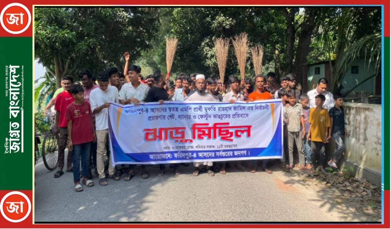 ফরিদপুরে গেট ভাঙচুর: নির্বাচনী প্রচারণায় বাধা, এমপি প্রার্থীর ঝাড়ু মিছিল